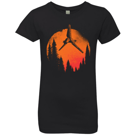 This Star Wars design show an X-Wing space ship flying through a forest with a bright orange full moon in the background